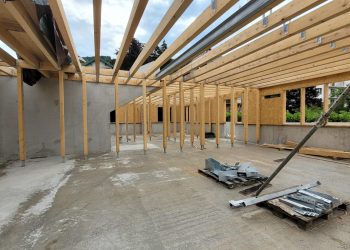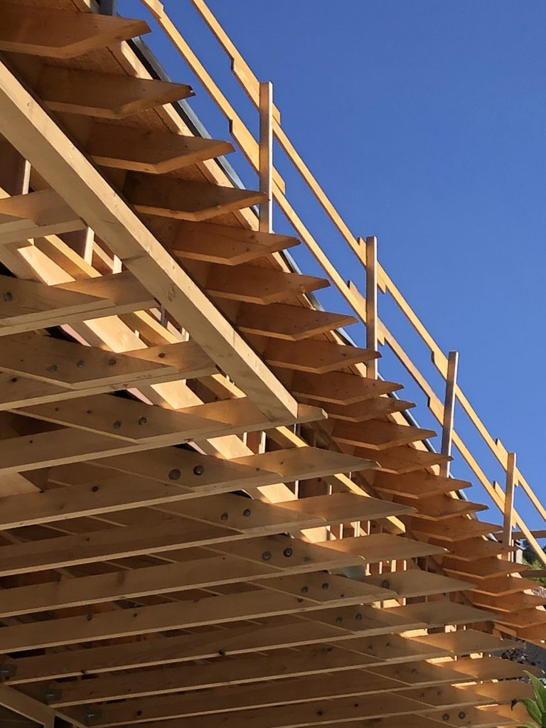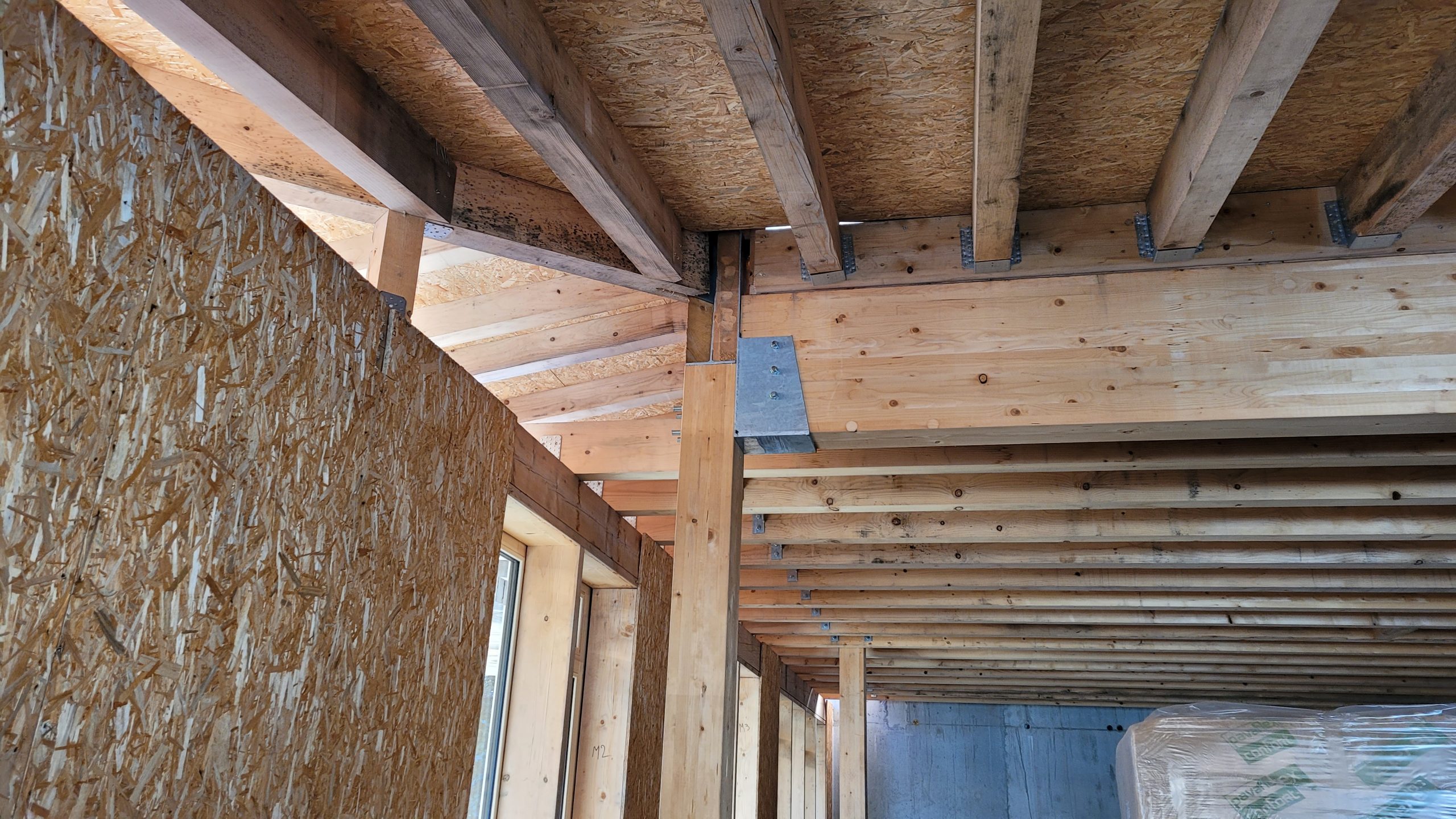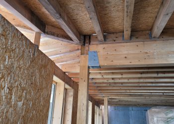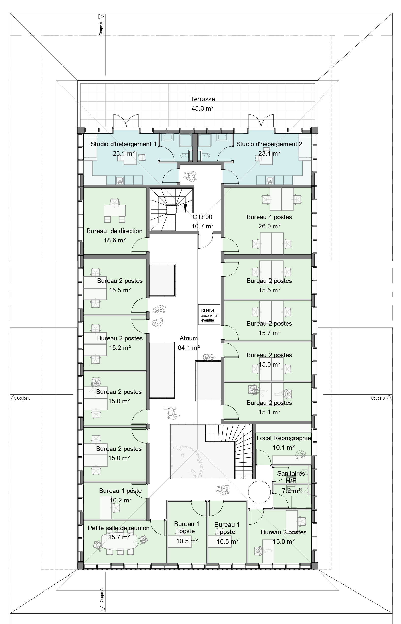 Une première rive de toit, surligne ce volume d’un trait de zinc, contrôle son exposition au soleil d’ouest et protège des intempéries la galerie qui les distribue.