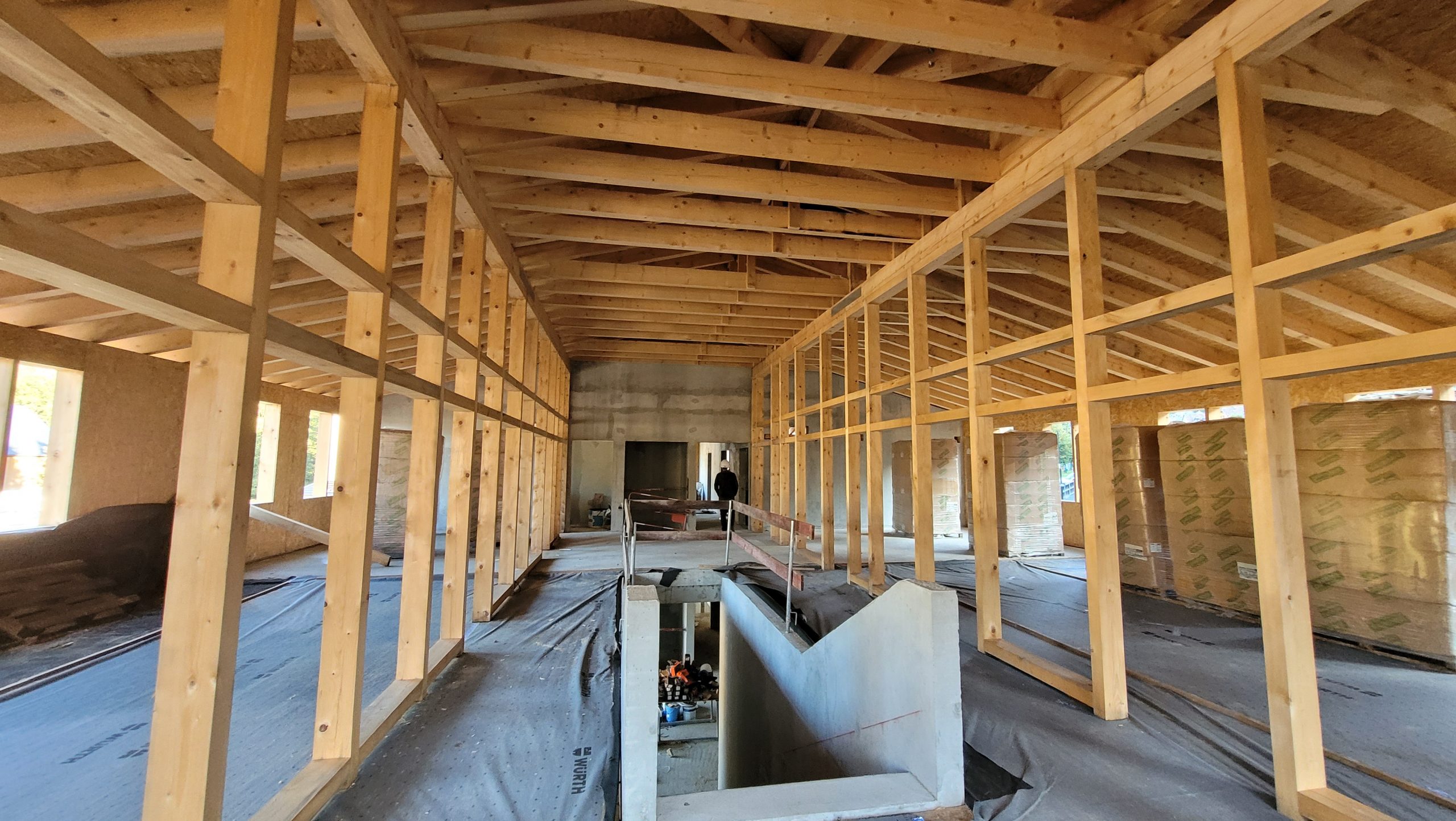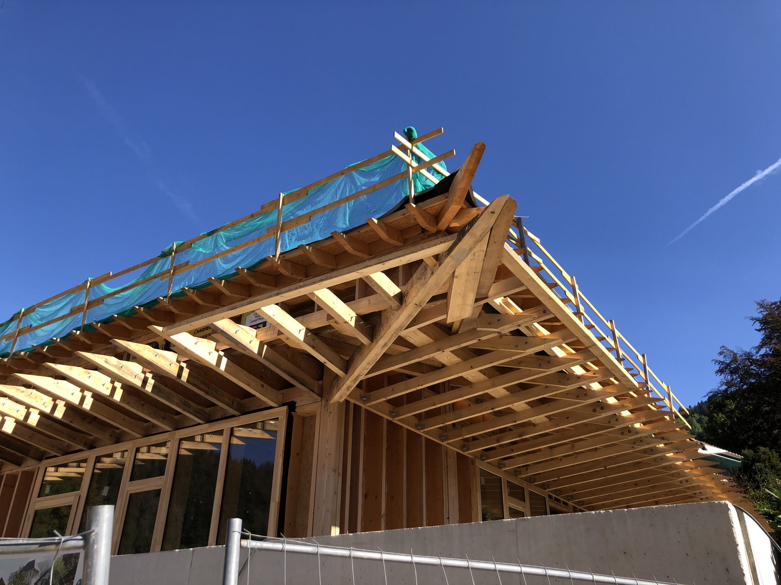 La strate supérieure est celle de l’étage du Parc, cernée du mur rideau bois qui offre aux bureaux la vue sur le paysage et la lumière naturelle. Une deuxième rive de zinc confirme l’horizontalité des lignes architecturales et accueille dans sa partie supérieure une couverture végétalisée spécifique, adaptée au climat de montagne. Ainsi revêtu, la perception du toit se lie à celle des prairies environnantes qui constitue le paysage. La césure au centre de la façade sud-ouest, qui désigne l’accès au sas thermique, est explicite de l’organisation du projet. D’un côté l’office du Tourisme, de l’autre la Maison du parc, deux partenaires distincts et autonomes mais solidaires et complémentaires