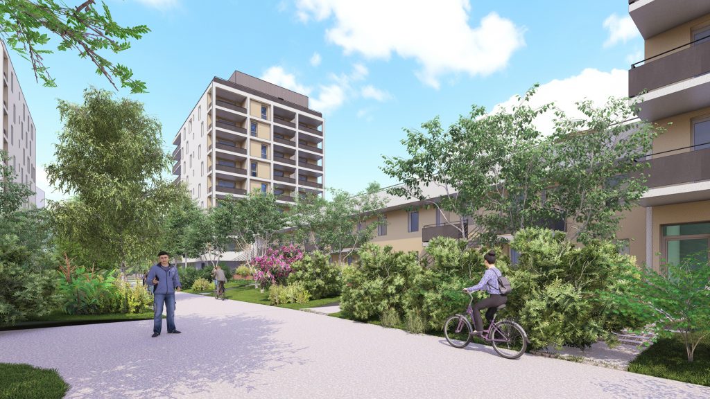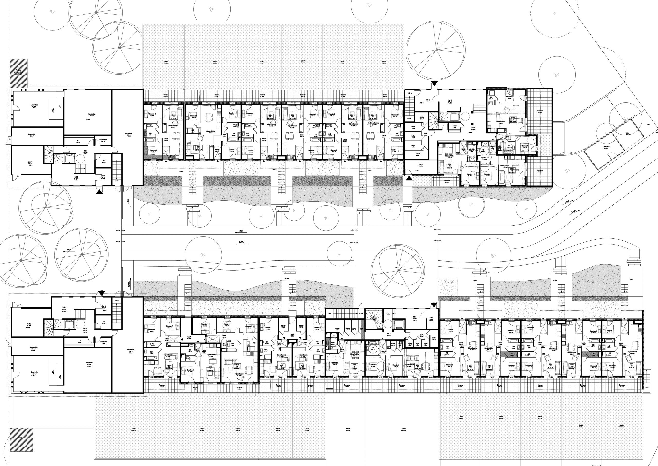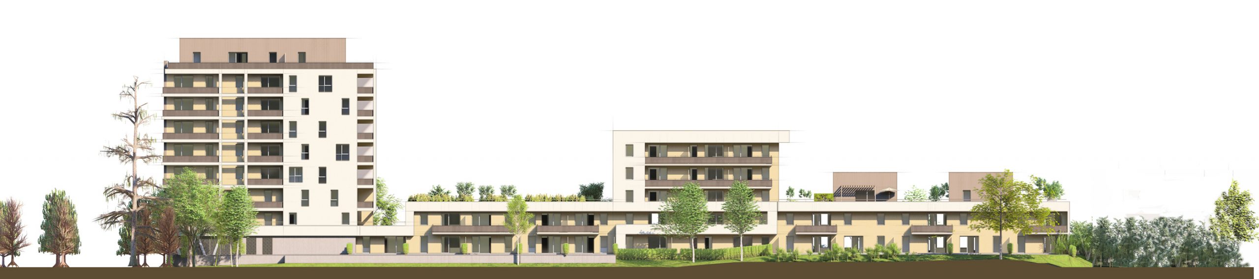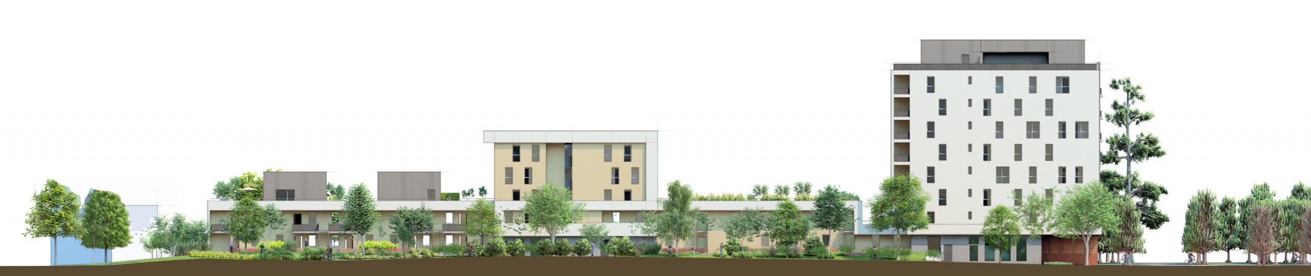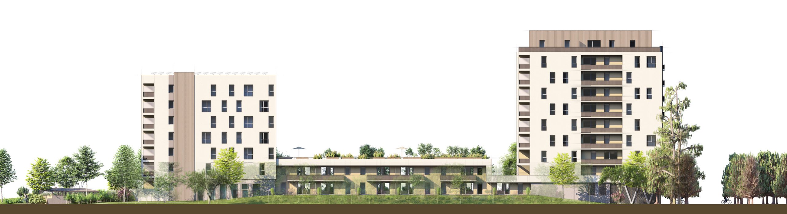 Ces bâtiments regroupent 152 logements. Chacune des deux bandes est structurée en RDC et R+1 par des logements traversants, dont l’accès se fait par la partie centrale, et donnant sur les faces Est et Ouest sur des jardins privatifs.