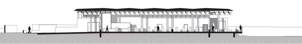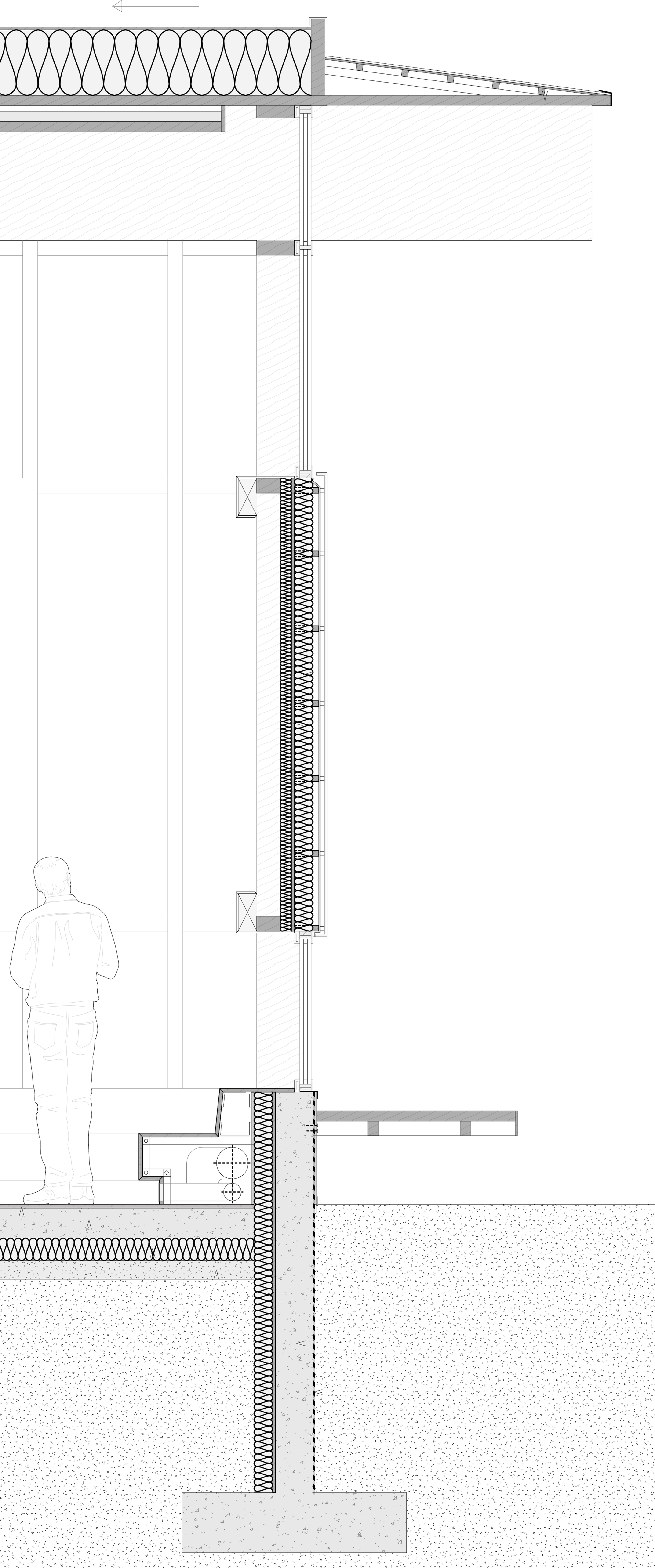 toit dans la même définition. Le rythme de ces ouvrages, horizontaux et verticaux, crée la modénature des trois façades de la halle et de l’imposte ouest, entre mur de terre et toiture, qui éclaire l‘allée centrale du projet.