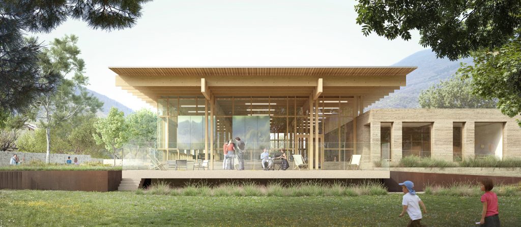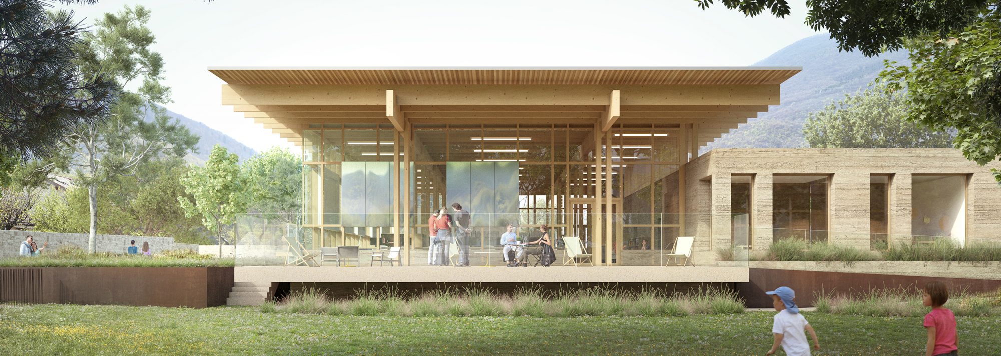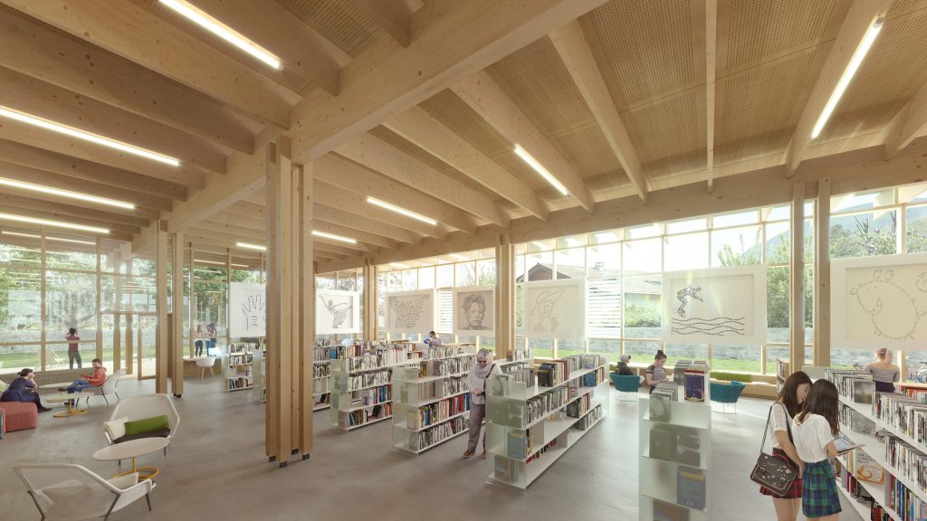 Le bois, la terre, la lumière et la ventilation naturelles inscrivent la médiathèque dans une démarche de construction bioclimatique et biosourcée. Les matériaux retenus, issus du territoire du projet, et les systèmes constructifs adoptés font appel à des techniques et des savoir-faire courants.