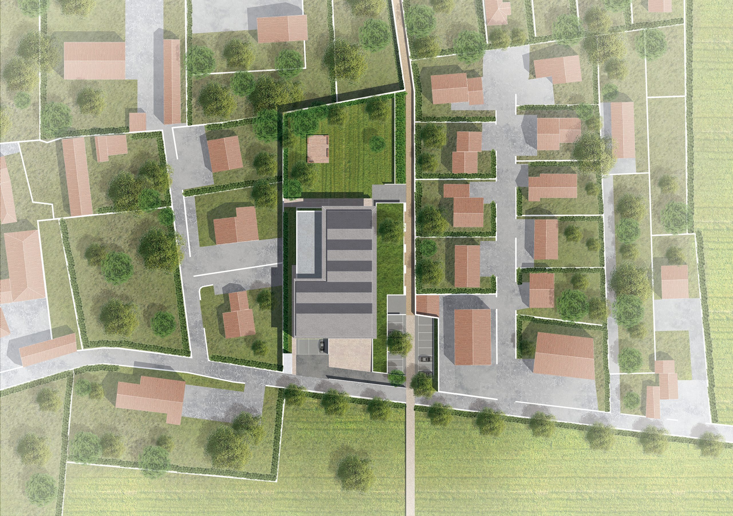 À l’ouest, un volume linéaire longe la clôture ouest du terrain et accueille les bureaux et la salle d’animation. Le haut gabarit de la salle constitue un signal fort sur la rue tandis que les bureaux, de plus faible hauteur, se développent vers le parc.