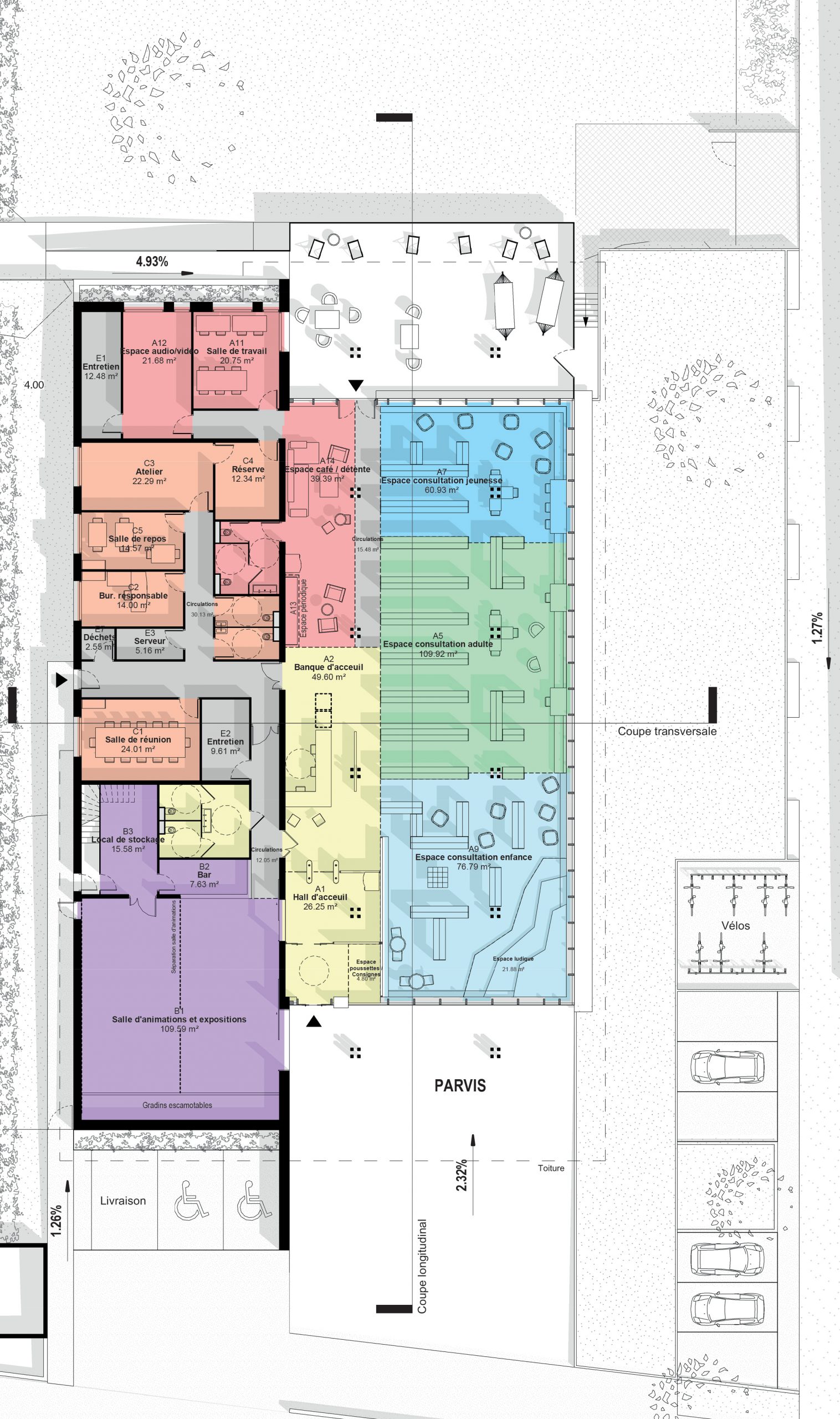 Le volume unique qui réunit les espaces publics de la médiathèque une charpente de poutres maitresses et de pannes de bois, portées par douze poteaux de bois. Ce schéma simple et explicite, rythmé par l’entre-axe de 1.30 m des pannes, définit également la densité des aiguilles de bois des murs rideaux qui constituent les façades. Ce dispositif construit le toit et, par le même ouvrage, le plafond de la médiathèque qui s’étend jusqu’au passées de
